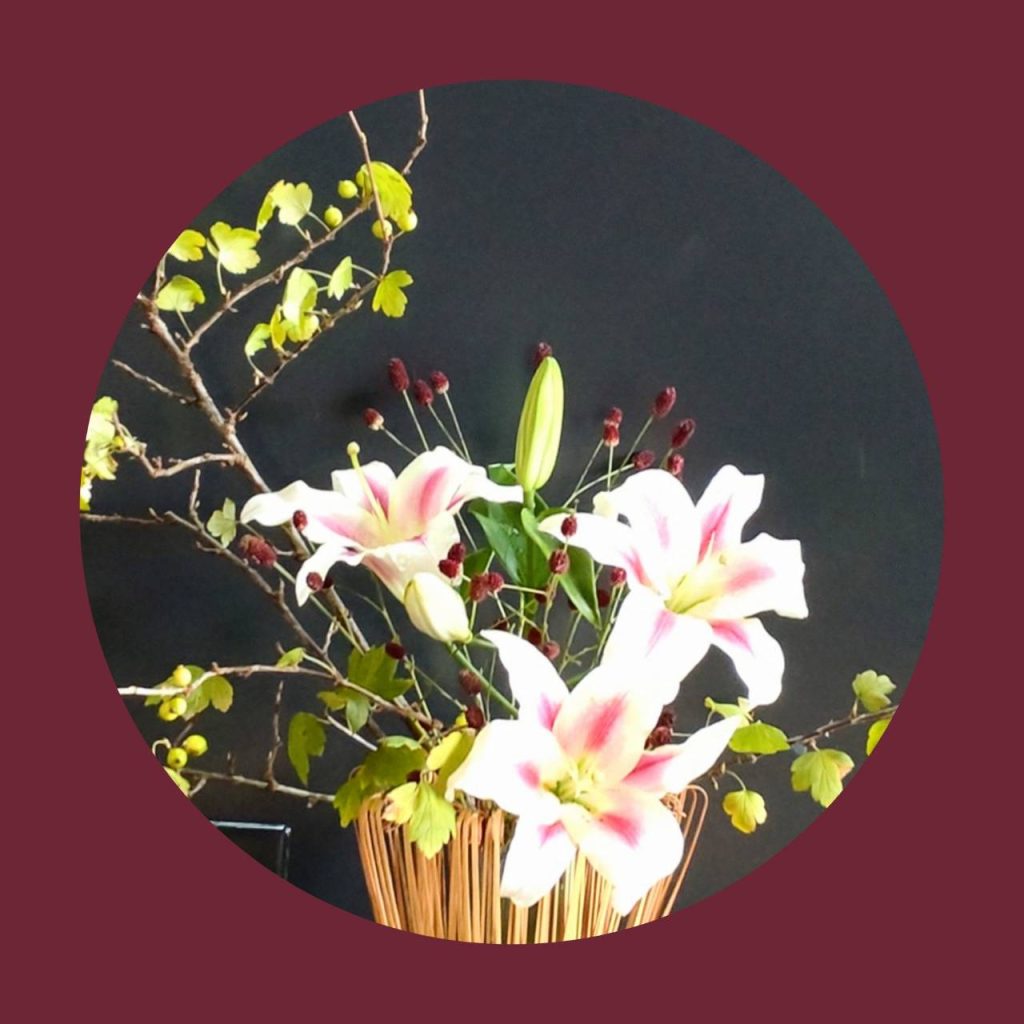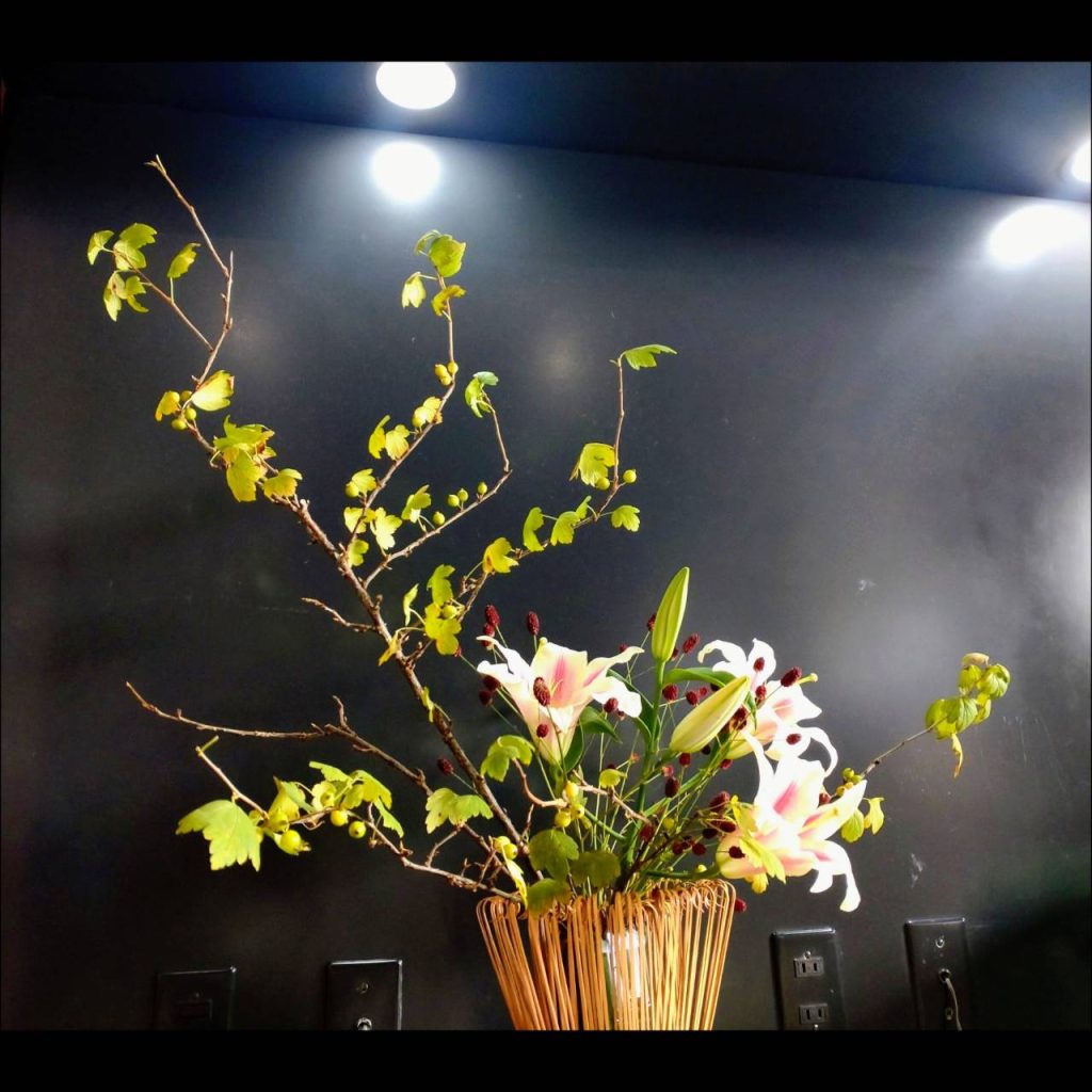 われもこうの黒っぽい赤が秋色ですよね。お似合いの百合があったので生けてみました。