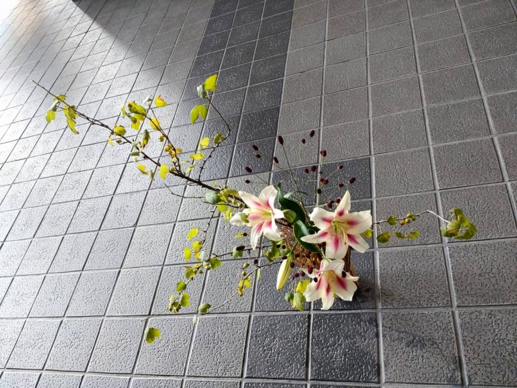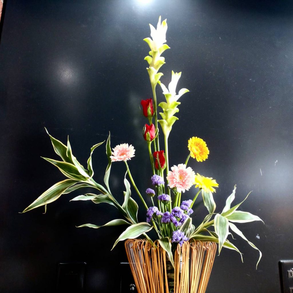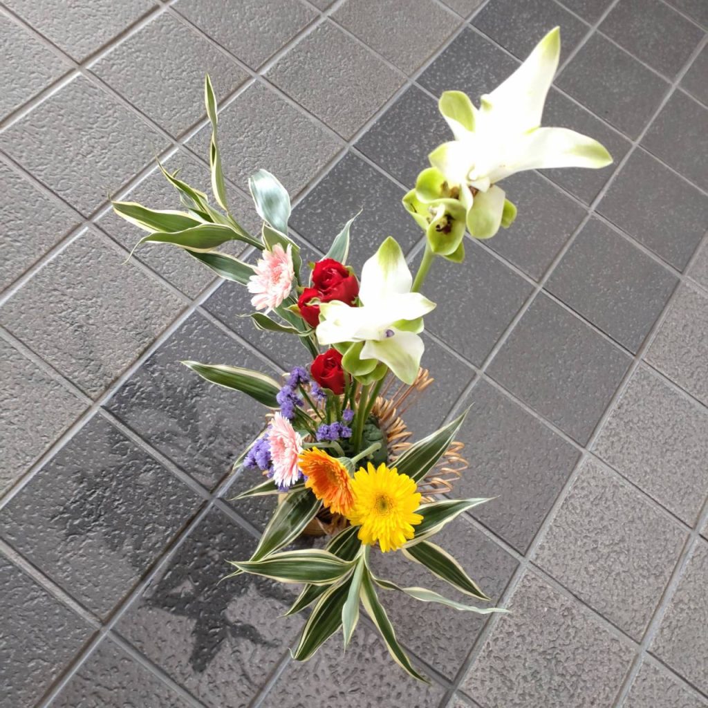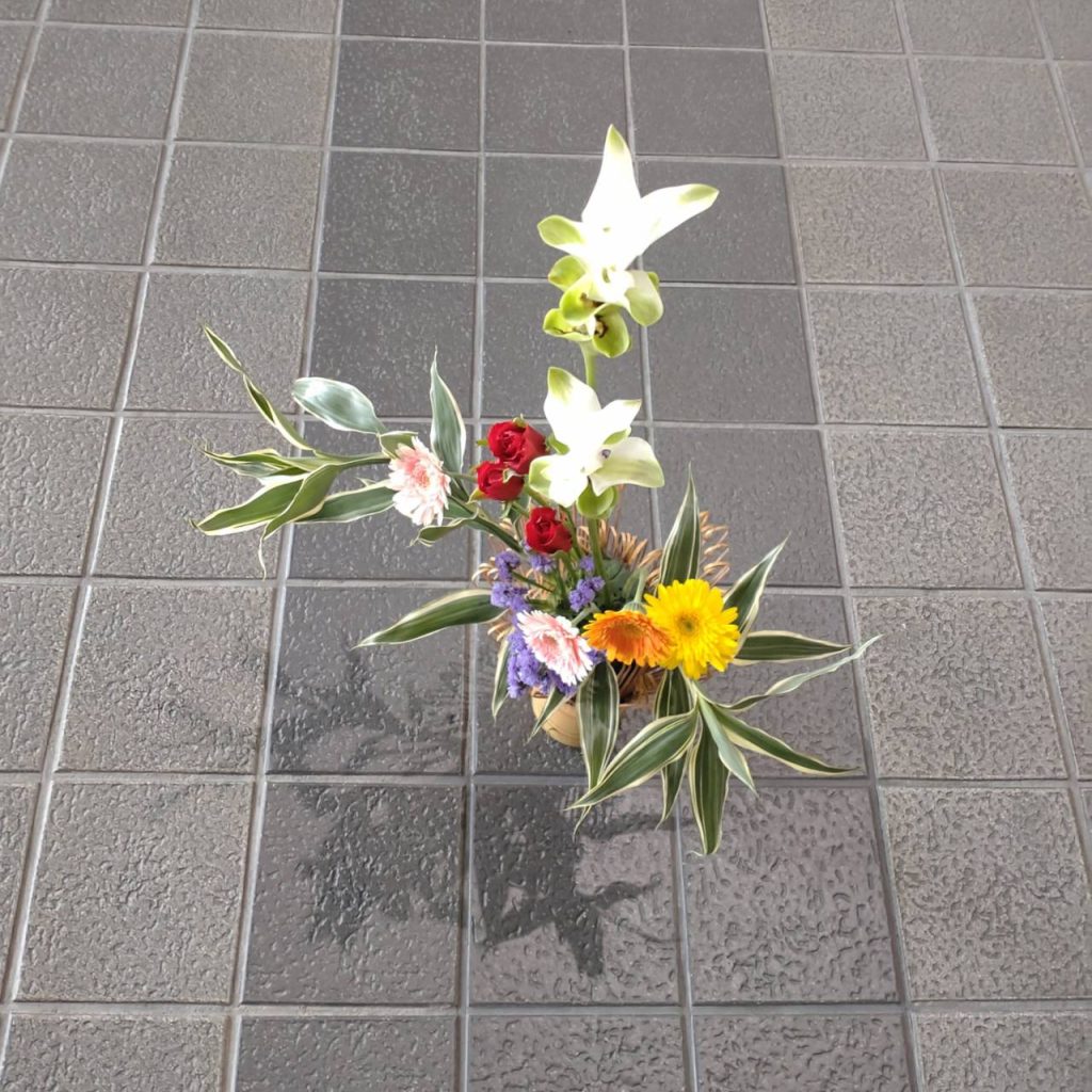 2階のエレベーター前には色とりどりの華やかなお花を生けております。