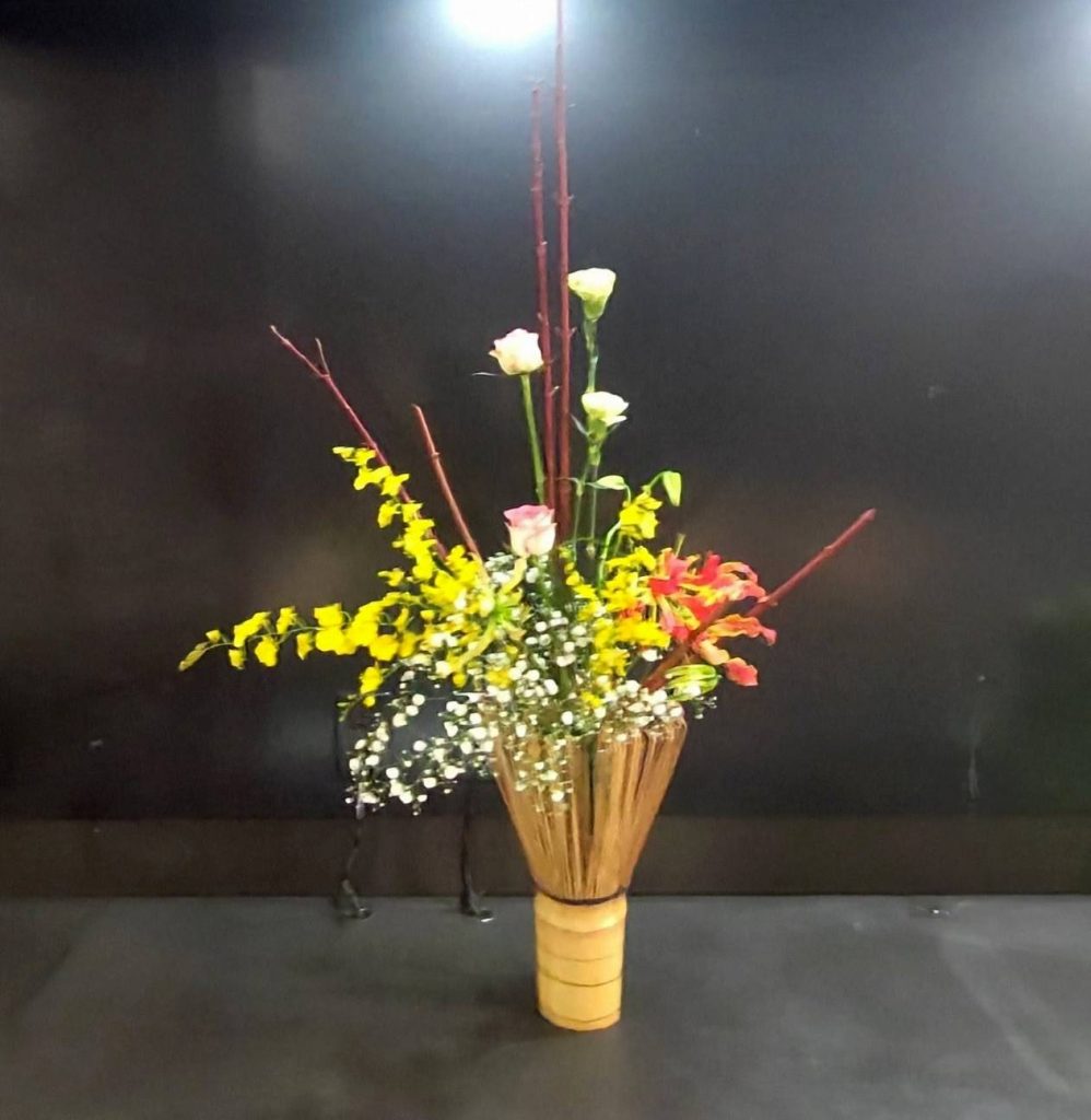 生駒市役所展示のエコ華道は、生駒市の伝統工芸品の茶筌の形をした花器「花立て茶筌」に花を生けております。