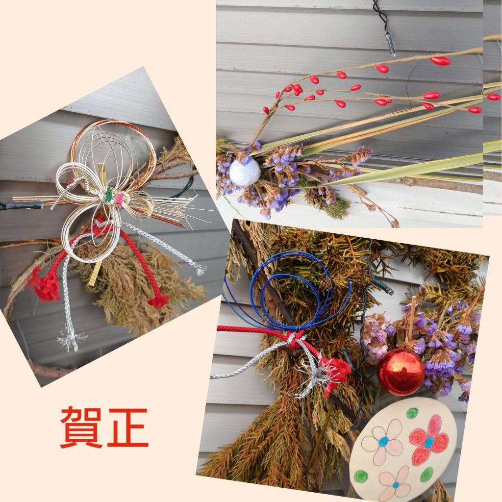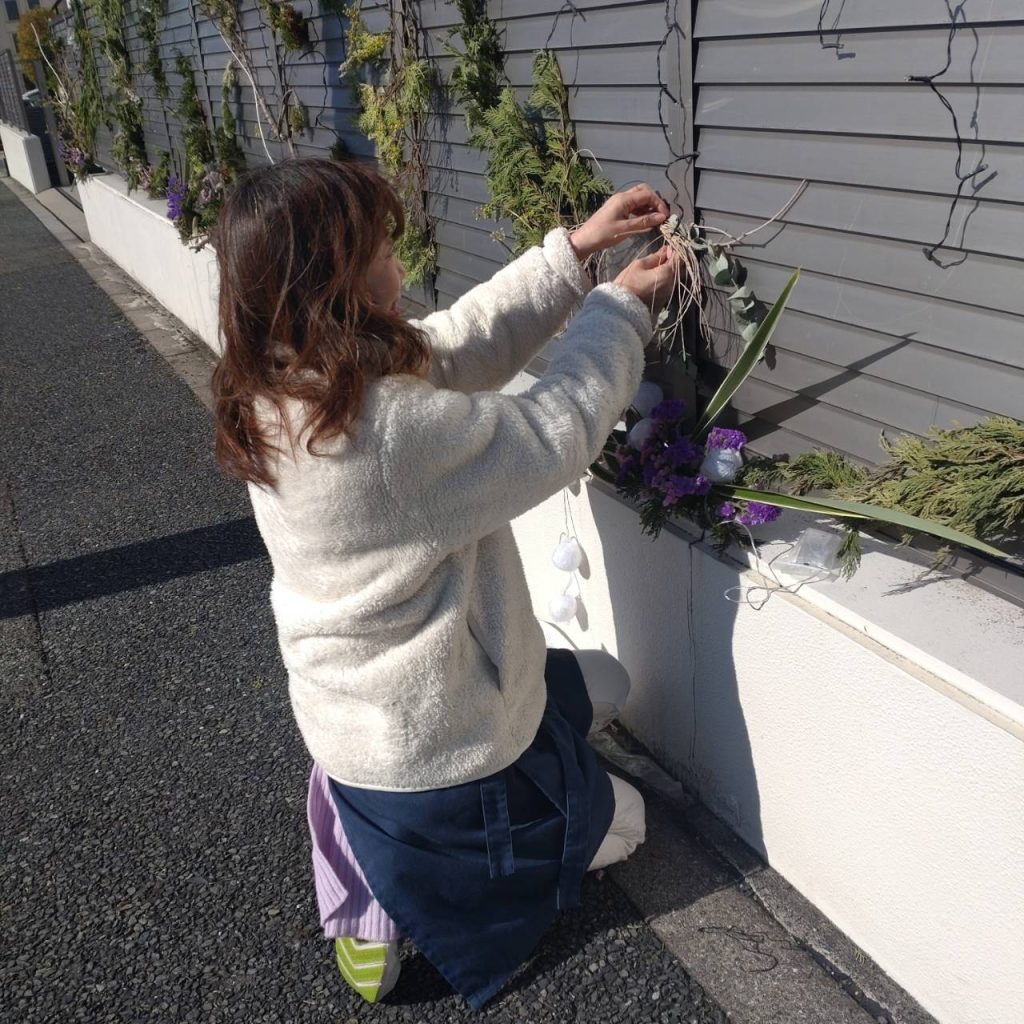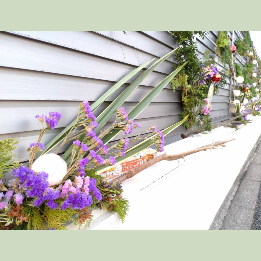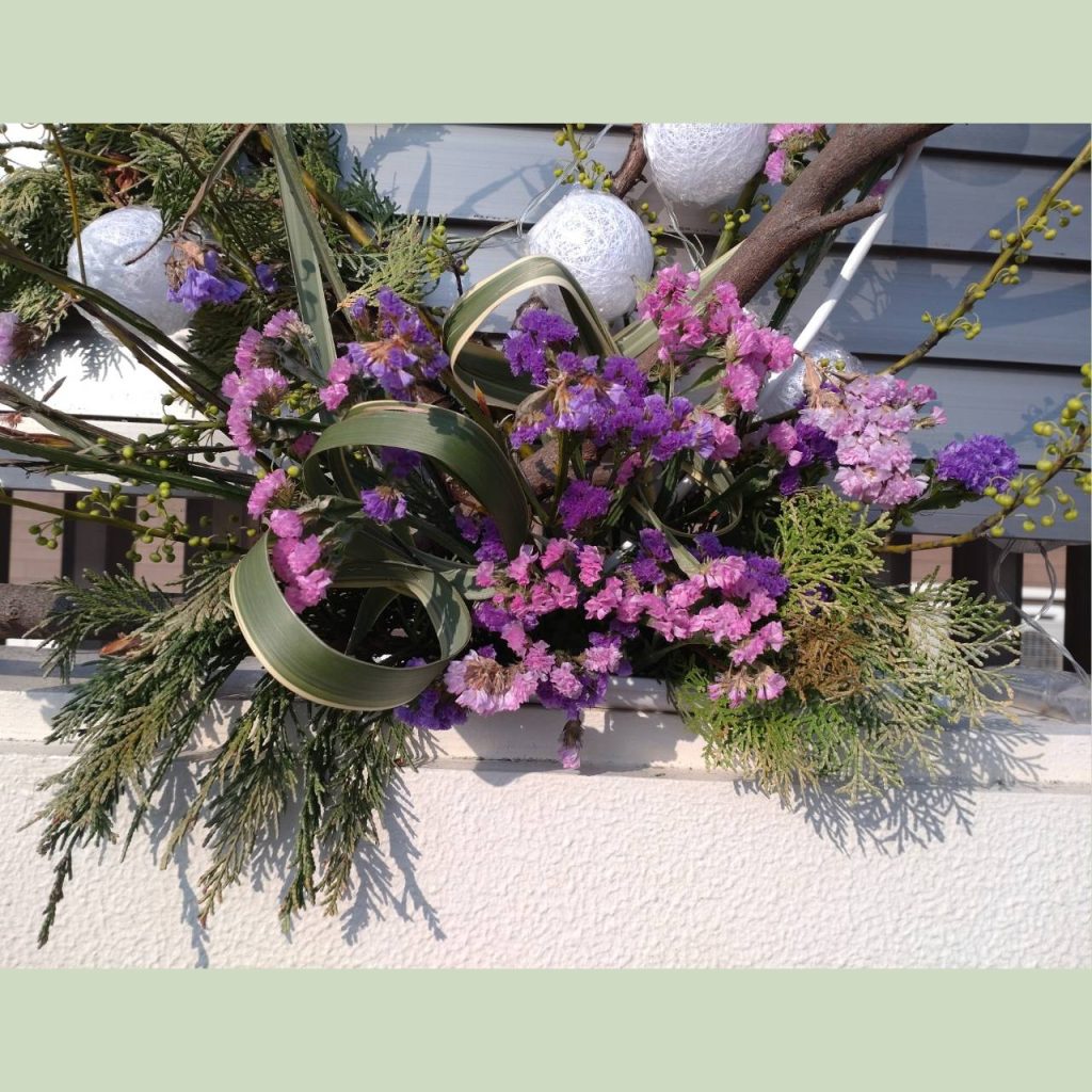 年が開けると、クリスマスからお正月の装飾に変えます。逞しいスターチスのおかげで長く飾り続けられることができます。