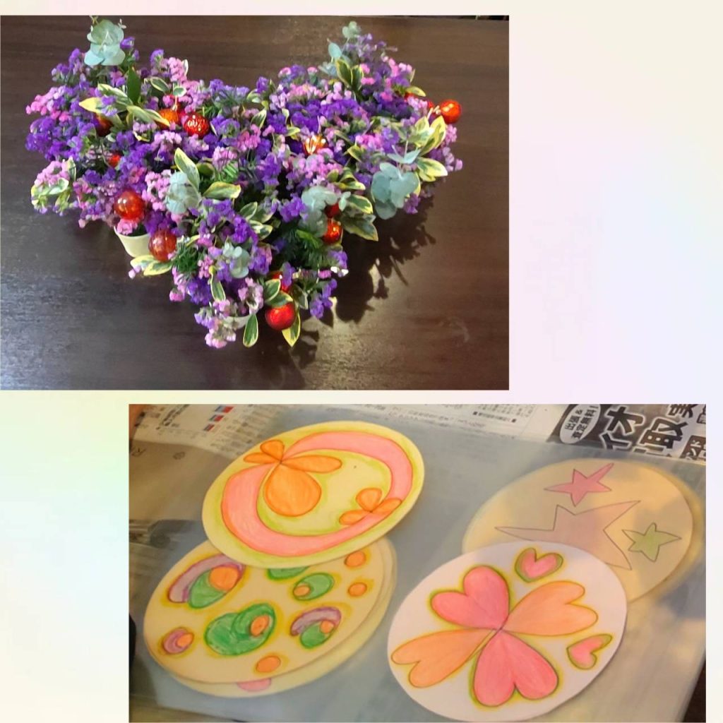 認知症高齢者の方々にはお花の作品と塗り絵の作成をしていただきました。