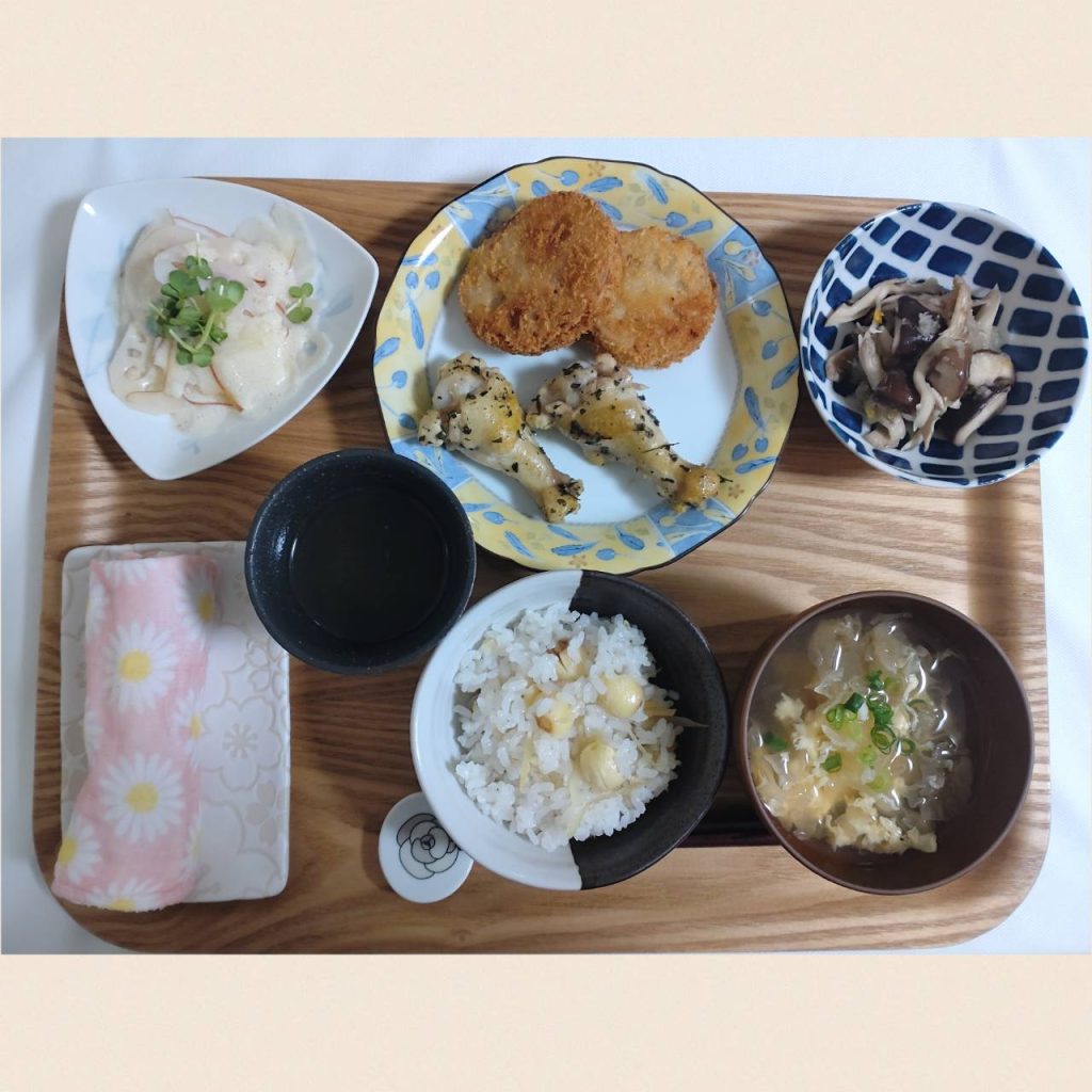 ・蓮の実と茗荷のご飯 ・白木耳と卵のスープ ・鶏の茶葉蒸し ・蓮根とジャガイモマシュフライ