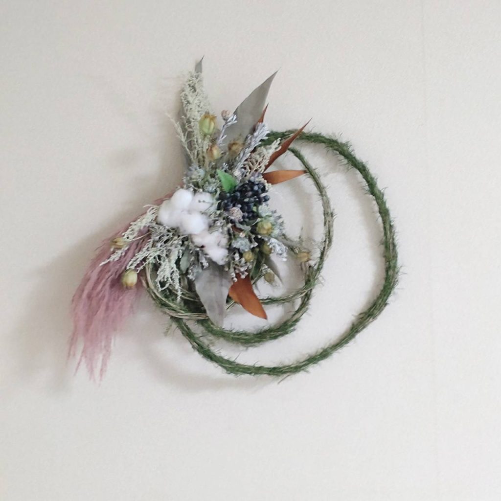 今回は殺菌効果の高いティーツリーをリースの枠に使っています。幾つか輪を作成して組み合わせていきます。