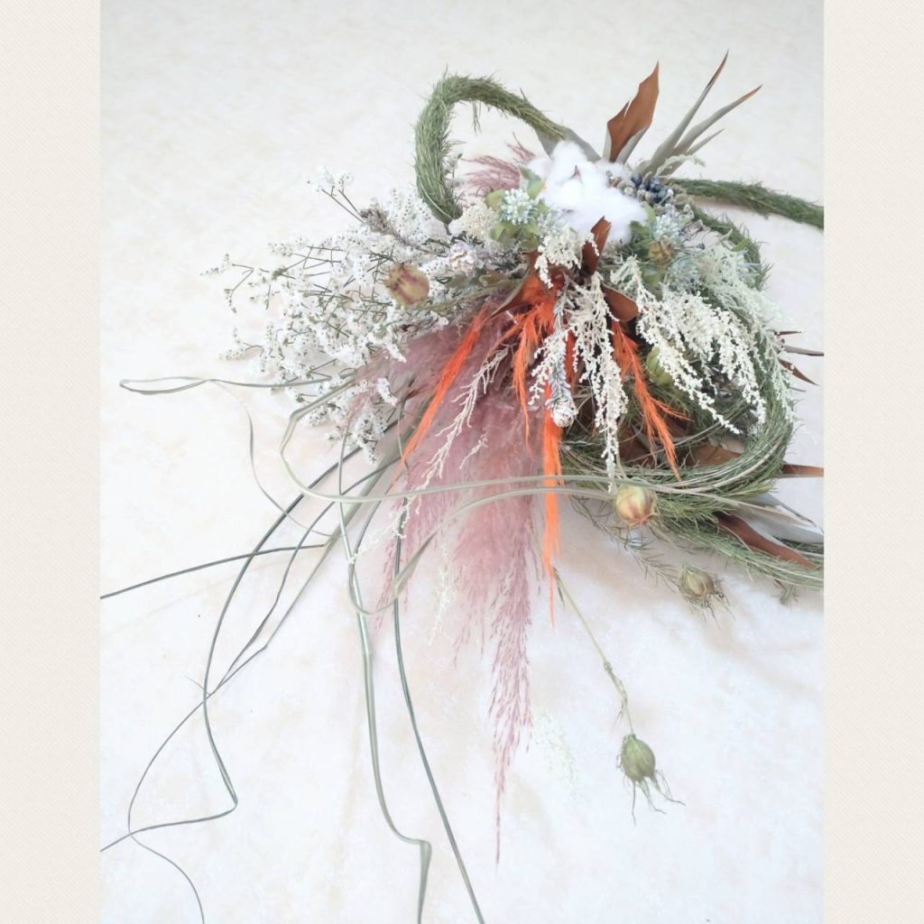 仕上がった作品にハイブリッドスターチスやススキを付け足したら更にごジャスになりましたよ。